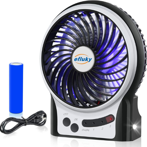 The Efluky fan is portable, runs on batteries, and is quiet. This makes it a great choice. It can be used both inside and outside, so you can take advantage of the summer weather. You can use it inside in your bedroom or office and outside when camping, hiking, or fishing. The Efluky Mini Fan is a great addition to the space of campers, people who live in dormers, and people who like to be outside. In addition to the blue emergency light, there is also an emergency light on the side, and the non-slip rubber bottom keeps it stable.