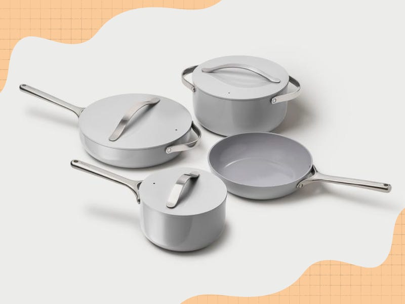 The Caraway Home set is shipped without any plastic bags, in recycled cardboard. Also, making the ceramic coating uses less CO2 than making other nonstick coatings. (But keep in mind that ceramic, like all nonstick coatings, is not as durable as stainless steel or other metals.) All together, this set is made to keep your kitchen clean, well-stocked, and free of clutter.