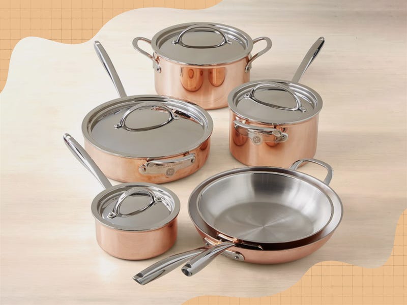 This set has everything we think is needed for a well-stocked kitchen, and the copper exterior is beautiful enough to show off when you’re not cooking. Thermo-Clad cookware can go in an oven up to 450 degrees, but you should never heat a copper pan that is empty. Check out our guide to copper cookware for more information on how to take care of your copper pots and pans.
