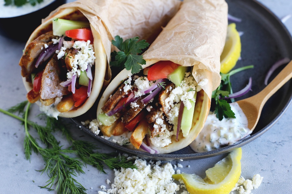 Put the kebab, a side of salad, some fried potatoes, and plenty of tzatziki in a pita to make a typical gyro.